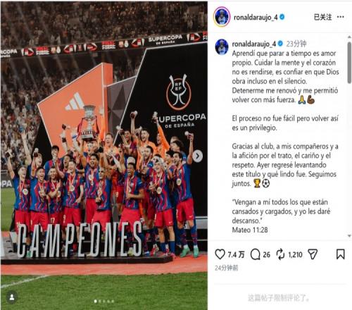 体育播报1月13日宣 巴萨后卫阿劳霍更新社媒动态,谈到了复出并随队赢得西超杯的感受。